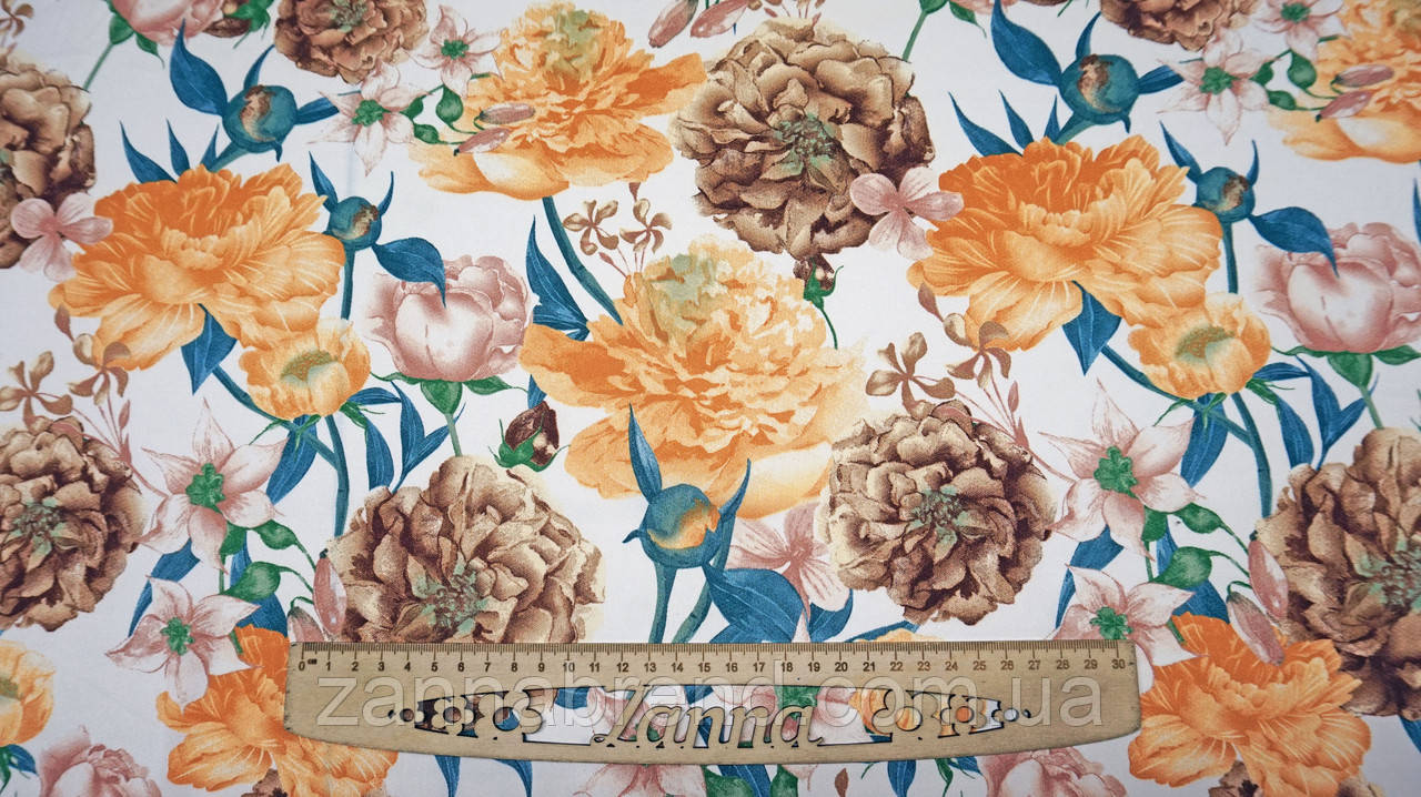 Тканина шовк Армані молочного кольору "Помаранчеві півонії" - це тонка, гладка, ніжна, струмуюча синтетична тканина плательно-блузкової групи, по вигляду нагадуюча натуральний шовк. Матеріал достатньо щільний, але при цьому тонкий, добре драпірується и гарно сідає по фігурі, підкреслюючи рельєфи і приховуючи недоліки.