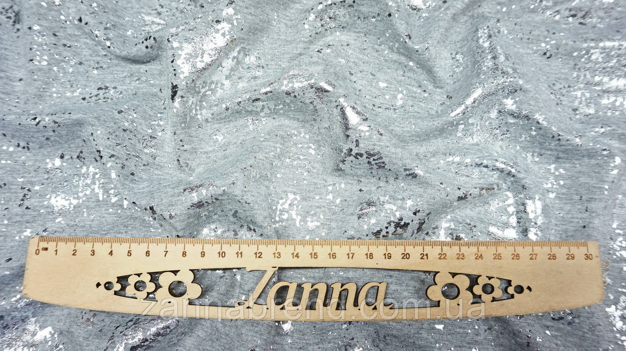 Тканина двонитка колір світло-сірий меланж із сріблястим принтом (Туреччина) - це щільний, але м'який бавовняний трикотаж. Лицьова сторона тканини гладка, на неї нанесений блискучий сріблястий абстрактний принт, який стійкий до прання і тривалий час зберігає привабливий зовнішній вигляд. Рекомендується делікатне прання!